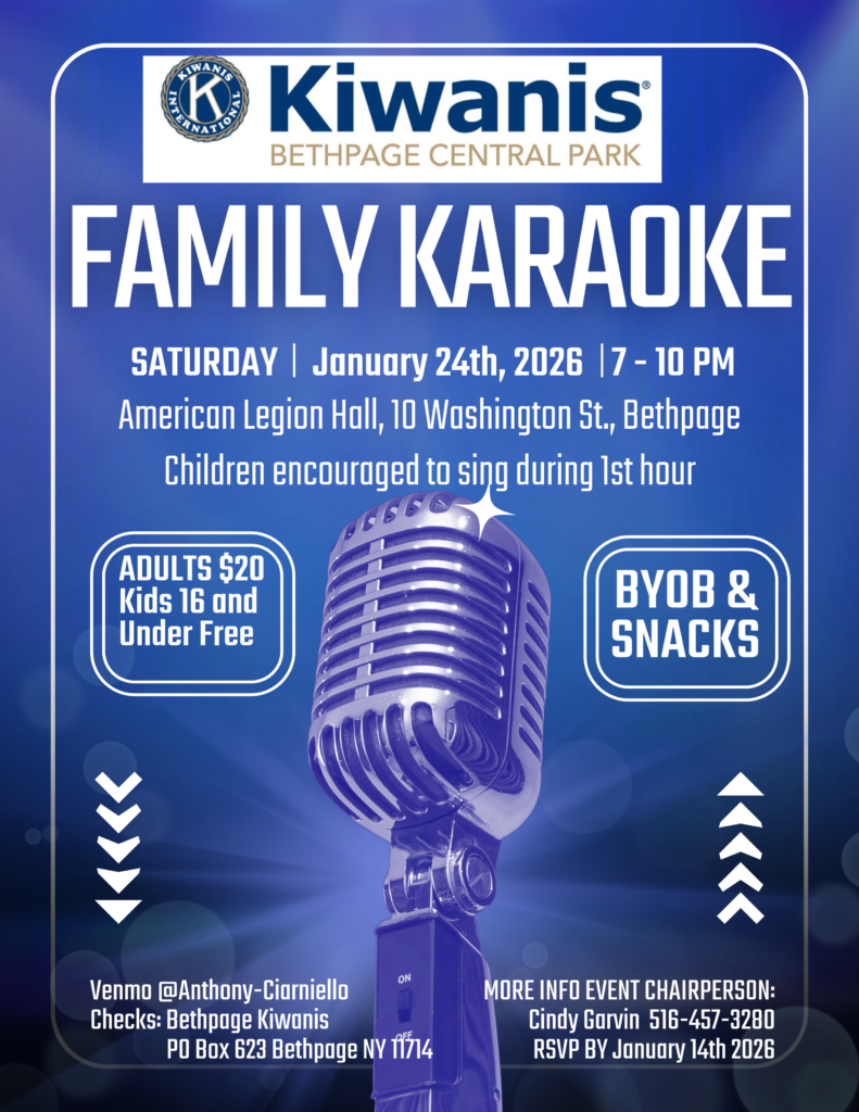 January 24th 2026. Bethpage Central Park Kiwanis hosted a Karaoke Night at the newly refurbished American Legion Hall located at 10 Washington Street in Bethpage. We’d like to thank Cindy Garvin who headed the committee to organize and bring this event to life. The Karaoke night was well attended by many of the members of LISC and Bethpage Kiwanis, along with our local friends, families and children.